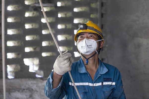 正在前往一線喂料樓的章利,勞保服已被汗水所浸透,干濕分明,手套、安全帽、勞保服在保障員工安全的同時,也見證著海螺人默默的付出。(龍新陽/攝)