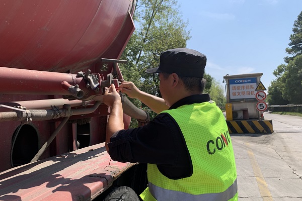 日光正盛,宣城海螺一號門外,保衛(wèi)人員陳程正在對散裝水泥出廠車輛進行鉛封,站好崗、守好責,他們是夏天的“炎值”和“門面”擔當。(謝能/攝)