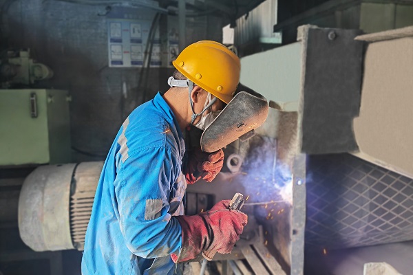 坐標烏茲別克斯坦,卡爾希海螺的技改工作正在有序進行中,這是水泥磨磨頭密封改造現(xiàn)場,烏籍員工加發(fā)在焊接作業(yè)中的背影。(孫艷偉/攝)