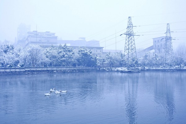 青山不老,因雪白頭。一場雪后,冬日的礦山覆上了一層冬裝,寒霧籠紗,遠處隱約空蒙,近處清明沉靜,唯有行駛的礦車打破了這份寧靜。白鵝在海螺湖上游蕩,一圈圈漣漪蕩漾開來,譜寫出一曲浪漫的冬日戀歌。山水皆靜,不由得想起明朝張岱的那篇《湖心亭看雪》:“余拏一小舟,擁毳衣爐火,獨往湖心亭看雪”。朔風(fēng)寒夜,掬一捧白雪,圍爐煮茶,亦是有滋有味。