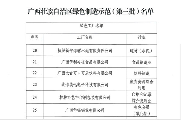 近日,廣西自治區(qū)工業(yè)信息化廳發(fā)布廣西第三批綠色工廠名單,扶綏新寧海螺水泥有限責(zé)任公司榜上有名,榮獲“自治區(qū)級綠色工廠”榮譽(yù)稱號。