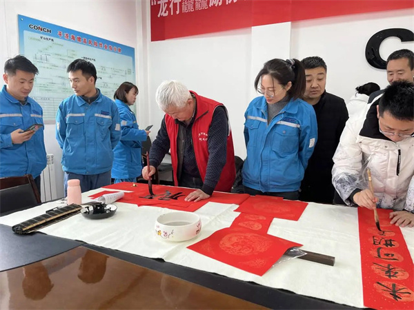 春聯(lián),表達(dá)著人們對新年迎祥納福的美好愿望。連日來,各地的書法家與海螺書法愛好者現(xiàn)場揮毫潑墨,寫春聯(lián)、送福字,壓紙、沾墨、起筆、收筆,一起一落之間,一幅幅寫滿祝福的春聯(lián)躍然紙上,將廣大員工對美好生活的向往書寫得淋漓盡致。還有的員工把對海螺的祝福寫進(jìn)了對聯(lián),一起來看看吧!