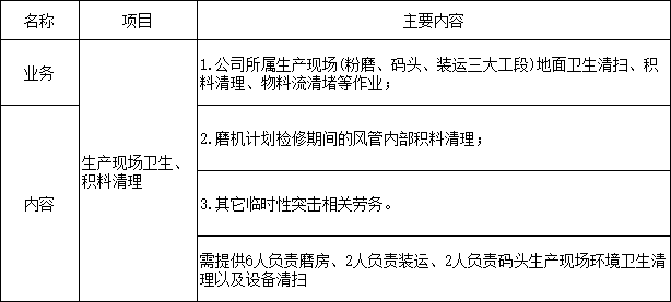 根據(jù)江門海螺水泥有限公司生產(chǎn)經(jīng)營需求,為確保招標人生產(chǎn)現(xiàn)場(粉磨、碼頭、裝運三大工段)地面衛(wèi)生清掃、積料清理、物料流清堵等作業(yè)開展,本著“公開、公平、公正”的原則,選擇經(jīng)營能力較好、經(jīng)營資質(zhì)合格、服務(wù)質(zhì)量較強的勞務(wù)公司承接招標人勞務(wù),歡迎具備條件的單位參加,現(xiàn)將有關(guān)事項公示如下: