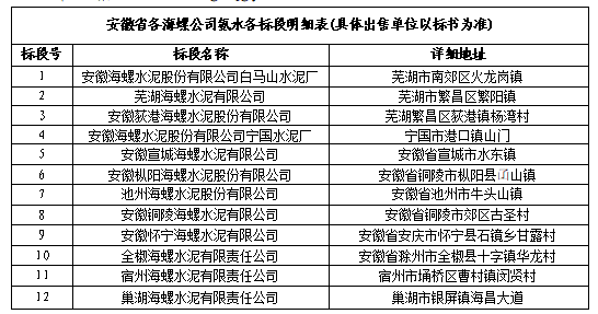 安徽荻港海螺水泥股份有限公司擬對安徽地區(qū)12家基地子公司(蕪湖海螺、荻港海螺、白馬廠、寧國廠、宣城海螺、銅陵海螺、池州海螺、樅陽海螺、懷寧海螺、宿州海螺、全椒海螺、巢湖海螺)2021-2022年度氨水進行聯(lián)合招標采購,為進一步體現(xiàn)公開、公平、公正、擇優(yōu)的原則,拓寬采購渠道,保證采購質(zhì)量,現(xiàn)將招標采購信息發(fā)布如下: