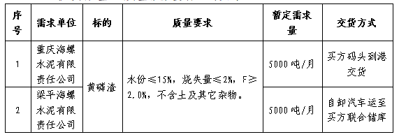 為進(jìn)一步提升黃磷渣采購(gòu)招標(biāo)的公平、公正、公開透明性,根據(jù)重慶、梁平海螺黃磷渣需求,現(xiàn)組織開展黃磷渣采購(gòu)招標(biāo),特將招標(biāo)事宜公告如下: