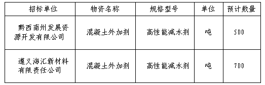 遵義海匯新材料有限責(zé)任公司與黔西南州發(fā)展資源開發(fā)有限公司擬對混凝土外加劑進(jìn)行公開招標(biāo)工作,選定供應(yīng)渠道?,F(xiàn)將相關(guān)事宜公示如下: