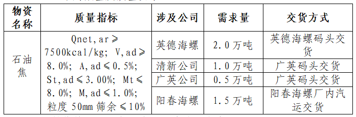 根據(jù)公司需求,擬對英德海螺、清新、廣英、陽春公司所需石油焦進(jìn)行招標(biāo),為進(jìn)一步體現(xiàn)公平、公正、公開的原則,現(xiàn)將招標(biāo)采購信息發(fā)布如下: