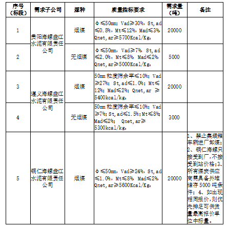 海螺水泥貴州區(qū)域擬對(duì)2021年11月21日至2021年12月20日生產(chǎn)用煤炭進(jìn)行公開(kāi)招標(biāo),選定中標(biāo)單位,現(xiàn)將相關(guān)招標(biāo)事宜公示如下: