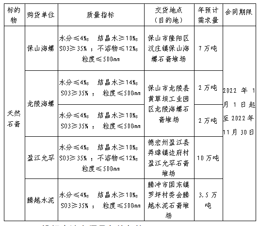 云南區(qū)域云西片區(qū)海螺公司擬對(duì)2022年度天然石膏進(jìn)行招標(biāo)采購,選定中標(biāo)人。本次招標(biāo)由云南區(qū)域保山海螺水泥有限責(zé)任公司負(fù)責(zé)組織實(shí)施。為體現(xiàn)公平、公正、公開的原則,拓寬采購渠道,通過網(wǎng)上海螺物資陽光采購平臺(tái)(網(wǎng)址http://ygcg.conch.cn)進(jìn)行公開招標(biāo),現(xiàn)將相關(guān)事宜公示如下: