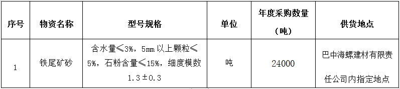 為進一步提升鐵尾礦砂采購招標(biāo)的公平、公正、公開透明性,根據(jù)巴中海螺建材(商混)生產(chǎn)需求情況,現(xiàn)組織開展鐵尾礦砂公開招標(biāo),特將招標(biāo)事宜公告如下: