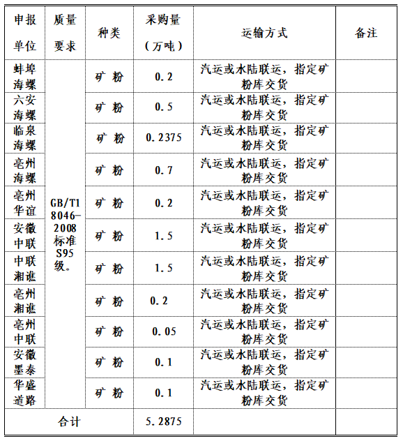 2.交貨地點(diǎn):蚌埠海螺、六安海螺、臨泉海螺、亳州海螺、亳州華誼、安徽中聯(lián)、中聯(lián)湘譙、亳州湘譙、亳州中聯(lián)、安徽墨泰、華盛道路十一家公司指定礦粉庫。