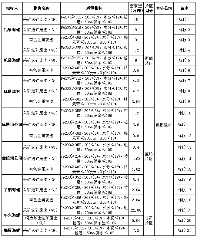 根據(jù)2022年度禮泉海螺、平?jīng)龊B荨⑶ш?yáng)海螺、乾縣海螺、臨夏海螺、鳳凰建材、金陵河公司、鳳凰山公司等8家公司生產(chǎn)經(jīng)營(yíng)計(jì)劃,現(xiàn)對(duì)2022年度鐵質(zhì)材料(直供)采購(gòu)組織招標(biāo),為進(jìn)一步體現(xiàn)公平、公正、公開透明的原則,此次招標(biāo)將在安徽海螺水泥股份有限公司陽(yáng)光采購(gòu)平臺(tái)公開進(jìn)行,現(xiàn)將招標(biāo)采購(gòu)信息發(fā)布如下: