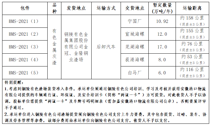 銅陵有色金屬集團(tuán)股份有限公司(簡稱“銅陵有色公司”)金冠、金隆銅業(yè)渣場至寧國廠、宣城海螺、蕪湖海螺、荻港海螺及白馬廠有色金屬灰渣運(yùn)輸項(xiàng)目,年運(yùn)量共計(jì)約53.92萬噸。