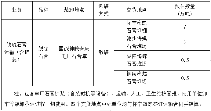 國(guó)能神皖安慶電廠至安徽懷寧海螺水泥有限公司、安徽池州海螺水泥股份有限公司、安徽樅陽(yáng)海螺水泥股份有限公司、安徽銅陵海螺水泥有限公司的脫硫石膏運(yùn)輸(含鏟裝)業(yè)務(wù)。