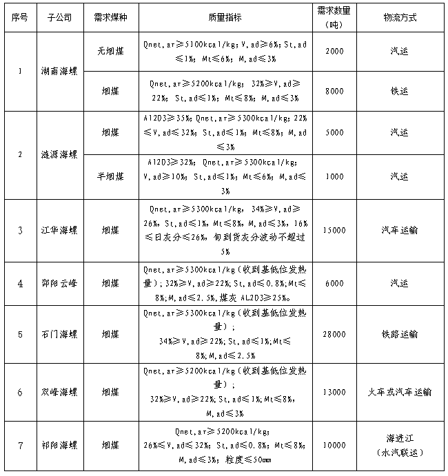 根據(jù)2022年1月21日-2022年2月20日海螺水泥湖南區(qū)域各子公司煤炭需求,現(xiàn)擬對煤炭進行公開招標,選定中標人,為體現(xiàn)公平、公正、公開的原則,拓寬采購渠道,現(xiàn)將招標相關事宜公告如下:
