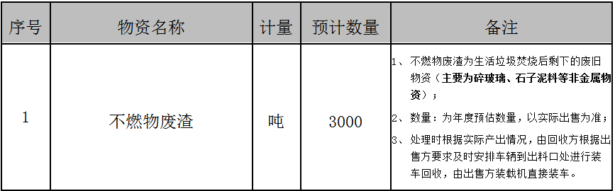 2. 不燃物廢渣為生活垃圾焚燒系統(tǒng)焚燒后的廢舊物資,從中標日起截止2023年4月14日期間垃圾焚燒所產(chǎn)生的不燃物廢渣,均由中標單位根據(jù)招標方要求分批次進行回收,現(xiàn)場直接裝車過磅,所產(chǎn)生的一切費用包含在投標報價內(nèi)。