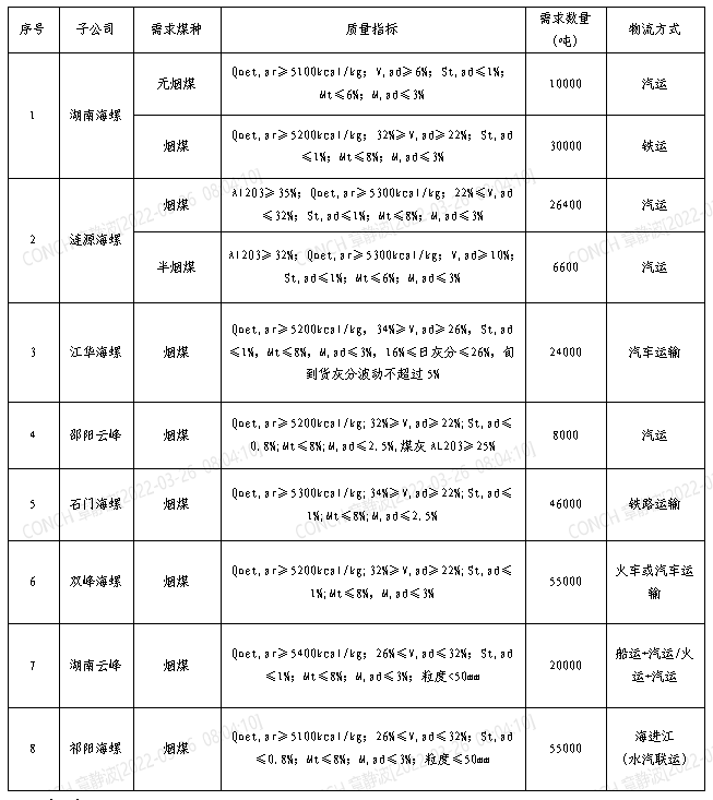 根據(jù)2022年4月21日-2022年5月20日海螺水泥湖南區(qū)域各子公司煤炭需求,現(xiàn)擬對(duì)煤炭進(jìn)行公開(kāi)招標(biāo),選定中標(biāo)人,為體現(xiàn)公平、公正、公開(kāi)的原則,拓寬采購(gòu)渠道,現(xiàn)將招標(biāo)相關(guān)事宜公告如下: