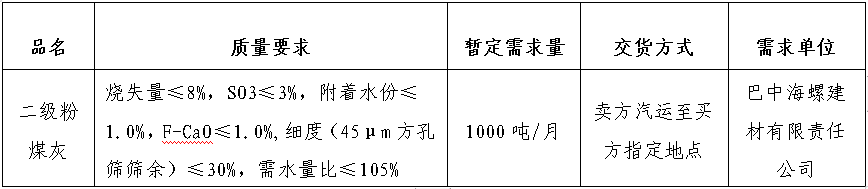 為進一步提升二級粉煤灰采購招標的公平、公正、公開透明性,根據(jù)巴中海螺建材二級粉煤灰需求,現(xiàn)組織開展二級粉煤灰公開招標,特將招標事宜公告如下: