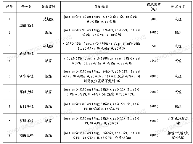 根據(jù)2022年6月21日-2022年7月20日海螺水泥湖南區(qū)域各子公司煤炭需求,現(xiàn)擬對煤炭進行公開招標(biāo),選定中標(biāo)人,為體現(xiàn)公平、公正、公開的原則,拓寬采購渠道,現(xiàn)將招標(biāo)相關(guān)事宜公告如下: