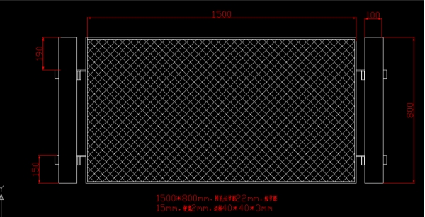 長*寬1500*800mm,網(wǎng)孔長節(jié)距22mm,短節(jié)距15mm,梗寬2mm,邊框角鐵40*40*3mm |