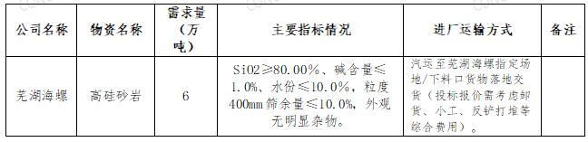 根據(jù)生產(chǎn)需求,本著“公開、公平、公正”的原則,蕪湖海螺供應(yīng)處擬對外購砂巖進行公開招標,歡迎具備條件的單位參加,現(xiàn)將招標相關(guān)事宜公告如下:
