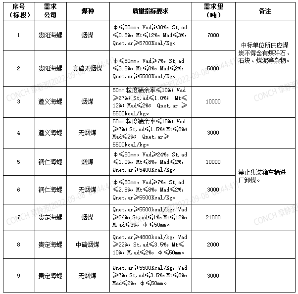 海螺水泥貴州區(qū)域擬對2022年9月21日至2022年10月20日生產(chǎn)用煤炭進行公開招標(biāo),選定中標(biāo)單位,現(xiàn)將相關(guān)招標(biāo)事宜公示如下: