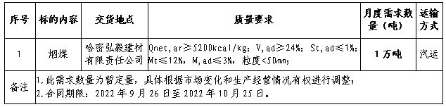 根據(jù)2022年10月份哈密弘毅建材公司煤炭需求,現(xiàn)擬對(duì)煤炭進(jìn)行招標(biāo),選定中標(biāo)人,本著公平、公正、公開的原則,拓寬采購(gòu)渠道,現(xiàn)將招標(biāo)相關(guān)事宜公告如下: