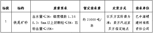 為進(jìn)一步提升鐵尾礦砂招標(biāo)的公平、公正、公開透明性,根據(jù)巴中海螺建材(商混)生產(chǎn)需求情況,現(xiàn)組織開展鐵尾礦砂公開招標(biāo),特將招標(biāo)事宜公告如下: