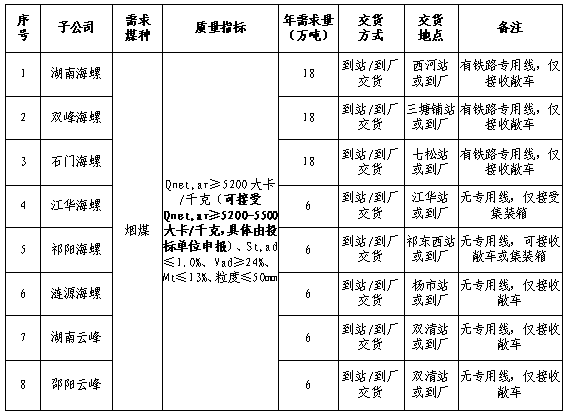 根據(jù)2023年海螺水泥湖南區(qū)域相關(guān)子公司:湖南海螺水泥有限公司(以下,簡稱“湖南海螺”)、雙峰海螺水泥有限公司(以下,簡稱“雙峰海螺”)、石門海螺水泥有限責(zé)任公司(以下,簡稱“石門海螺”)、江華海螺水泥有限責(zé)任公司(以下,簡稱“江華海螺”)、祁陽海螺水泥有限責(zé)任公司(以下,簡稱“祁陽海螺”)、漣源海螺水泥有限責(zé)任公司(以下,簡稱“漣源海螺”)、湖南省云峰水泥有限公司(以下,簡稱“湖南云峰”)、邵陽市云峰新能源科技有限公司(以下,簡稱“邵陽云峰”)8家子公司的非統(tǒng)購直供煤炭采購需求,擬組織湖南區(qū)域2023年非統(tǒng)購煤炭直供渠道準(zhǔn)入網(wǎng)上公開招標(biāo),選定中標(biāo)人。本次招標(biāo)由區(qū)域物資采購中心牽頭,湖南海螺組織,為拓寬采購渠道,同時體現(xiàn)公平、公正、公開原則,現(xiàn)將招標(biāo)相關(guān)事宜公告如下: