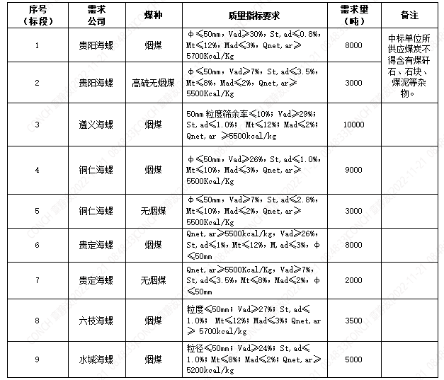 海螺水泥貴州區(qū)域擬對(duì)2022年12月5日至2022年12月20日生產(chǎn)用煤炭進(jìn)行公開招標(biāo),選定中標(biāo)單位,現(xiàn)將相關(guān)招標(biāo)事宜公示如下: