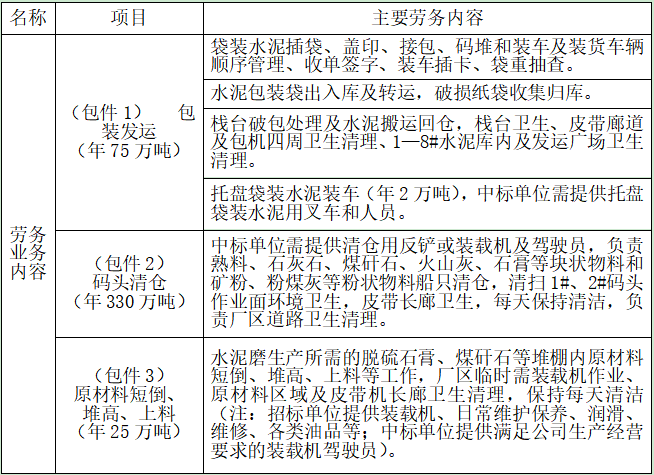 以上包件勞務合同期限為1年(自勞務合同簽訂之日起計算),招標人年水泥包裝量約75萬噸,年碼頭清倉量約330萬噸、年原材料短倒上料量約25萬噸,具體以實際發(fā)生數(shù)量為準。