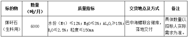 根據(jù)巴中海螺生產(chǎn)經(jīng)營需求,現(xiàn)對生料用煤矸石采購業(yè)務進行公開招標,為體現(xiàn)公平、公正、公開、透明的原則,現(xiàn)將招標相關(guān)事宜公告如下: