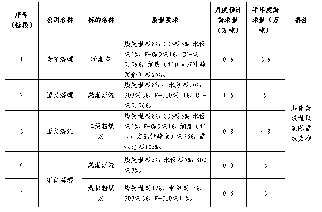 海螺水泥貴州區(qū)域擬對2021年下半年水泥生產(chǎn)用粉煤灰、燃煤爐渣進(jìn)行二次公開招標(biāo),選定中標(biāo)單位,現(xiàn)將相關(guān)招標(biāo)事宜公示如下: