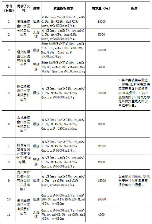 海螺水泥貴州區(qū)域擬對2021年7月21日至2021年8月20日生產(chǎn)用煤炭進(jìn)行公開招標(biāo),選定中標(biāo)單位,現(xiàn)將相關(guān)招標(biāo)事宜公示如下: