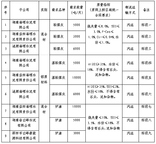 根據(jù)湖南、漣源、益陽(yáng)海螺、湖南云峰和邵陽(yáng)云峰五家公司2021年9月1日至2022年2月28日電廠廢渣(含粉煤灰、濕粉煤灰、爐渣等)的需求,現(xiàn)擬對(duì)電廠廢渣進(jìn)行招標(biāo),選定中標(biāo)人,為體現(xiàn)公平、公正、公開(kāi)的原則,拓寬采購(gòu)渠道,現(xiàn)通過(guò)海螺物資陽(yáng)光采購(gòu)平臺(tái)(登陸網(wǎng)址:ygcg.conch.cn)進(jìn)行公開(kāi)招標(biāo),招標(biāo)相關(guān)事宜公告如下: