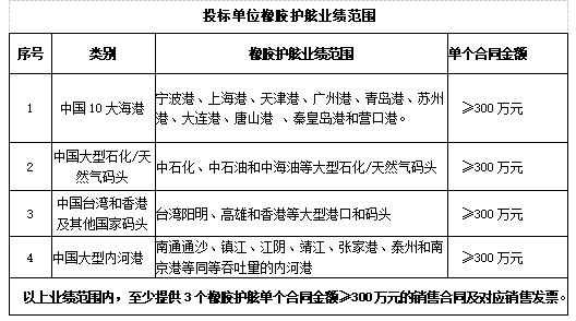 2、投標(biāo)單位需具有國(guó)內(nèi)10大港口(含下轄港口),或大型石化和天然氣碼頭,或香港和臺(tái)灣大型港口,或中國(guó)主要內(nèi)河港口的橡膠護(hù)舷銷售業(yè)績(jī),至少提供3個(gè)以上單筆直銷合同額超過(guò)300萬(wàn)元業(yè)績(jī)(其他港口、碼頭的橡膠護(hù)舷業(yè)績(jī)或非橡膠護(hù)舷產(chǎn)品業(yè)績(jī),或單個(gè)訂單低于300萬(wàn)元橡膠護(hù)舷業(yè)績(jī)不計(jì)算在內(nèi)),詳見(jiàn)附件1。