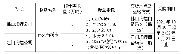 安徽海螺水泥股份有限公司廣東區(qū)域下屬的佛山、江門、海螺兩家家公司擬聯(lián)合開展石灰石粉末公開招標(biāo)工作,為進(jìn)一步體現(xiàn)公平、公正、公開的原則,拓寬采購渠道,提高采購質(zhì)量,現(xiàn)將相關(guān)事宜公告如下: