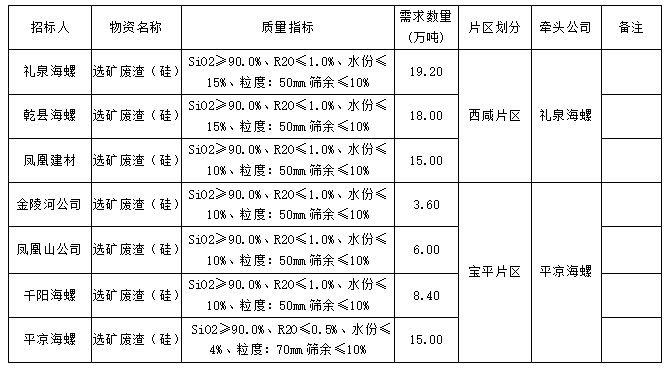 根據(jù)禮泉海螺、平?jīng)龊B荨⑶ш?yáng)海螺、乾縣海螺、金陵河公司、鳳凰山公司及鳳凰建材等7家公司生產(chǎn)經(jīng)營(yíng)計(jì)劃,現(xiàn)擬對(duì)2022年生產(chǎn)用選礦廢渣(硅)采購(gòu)組織招標(biāo),為進(jìn)一步體現(xiàn)公平、公正、公開(kāi)透明的原則,此次招標(biāo)將在安徽海螺水泥股份有限公司陽(yáng)光采購(gòu)平臺(tái)公開(kāi)進(jìn)行,現(xiàn)將招標(biāo)采購(gòu)信息發(fā)布如下: