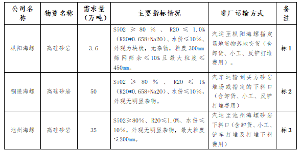 根據(jù)池州、銅陵和樅陽海螺公司實(shí)際生產(chǎn)需求,本著“公開、公平、公正”的原則,擬對直供高硅砂巖進(jìn)行公開招標(biāo),歡迎具備條件的單位參加,現(xiàn)將招標(biāo)相關(guān)事宜公告如下: