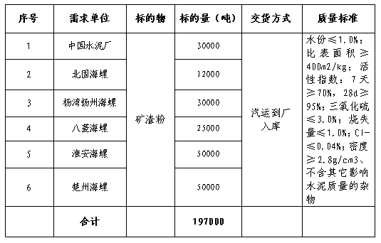 根據生產經營需求,本著“公開、公平、公正、誠實信用和競爭、擇優(yōu)”原則,海螺水泥江蘇區(qū)域下屬中國水泥廠、北固海螺、楊灣海螺、揚州海螺、八菱海螺、淮安海螺、楚州海螺等七家公司擬聯合開展礦渣粉公開招標,歡迎具備條件的單位參加,現將招標相關事項公示如下: