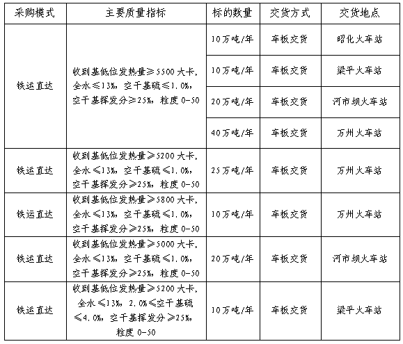 2.鐵路直達(dá)(梁平高硫煤)定價(jià)原則:參照鐵路直達(dá)煙煤年度長(zhǎng)協(xié)到站價(jià)格為基準(zhǔn),折算成合同標(biāo)準(zhǔn)熱值標(biāo)準(zhǔn)后,下浮**元/噸(下浮不得低于10元/噸,由投標(biāo)單位填報(bào))確定當(dāng)月煤炭供貨價(jià)格。