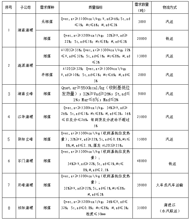 根據(jù)2021年12月21日-2022年1月20日海螺水泥湖南區(qū)域各子公司煤炭需求,現(xiàn)擬對煤炭進行公開招標(biāo),選定中標(biāo)人,為體現(xiàn)公平、公正、公開的原則,拓寬采購渠道,現(xiàn)將招標(biāo)相關(guān)事宜公告如下: