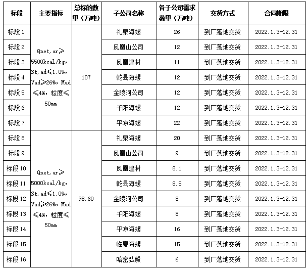 根據(jù)2022年陜甘區(qū)域各子公司煤炭需求,為保障各公司生產(chǎn),擬對(duì)2022年煤炭采購(gòu)進(jìn)行公開招標(biāo),為體現(xiàn)公平、公正、公開的原則,此次招標(biāo)將在安徽海螺水泥股份有限公司陽光采購(gòu)平臺(tái)公開進(jìn)行,現(xiàn)將招標(biāo)相關(guān)事宜公告如下: