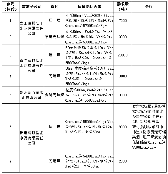 海螺水泥貴州區(qū)域擬對(duì)2022年1月21日至2022年2月20日生產(chǎn)用煤炭進(jìn)行公開(kāi)招標(biāo),選定中標(biāo)單位,現(xiàn)將相關(guān)招標(biāo)事宜公示如下: