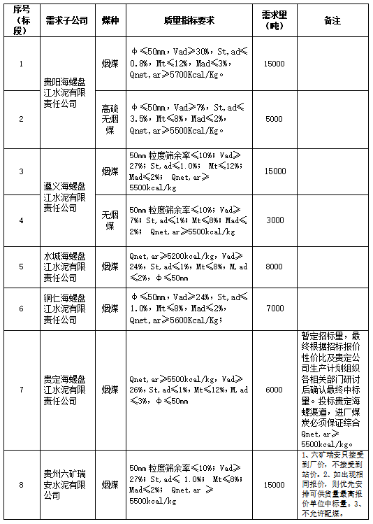 海螺水泥貴州區(qū)域擬對2022年2月21日至2022年3月20日生產(chǎn)用煤炭進行公開招標(biāo),選定中標(biāo)單位,現(xiàn)將相關(guān)招標(biāo)事宜公示如下: