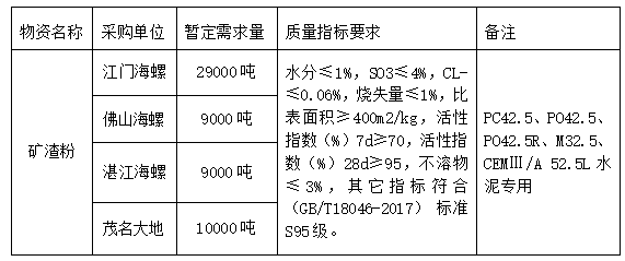 按照廣東區(qū)域供應專業(yè)組2022年招標計劃安排,安徽海螺水泥股份有限公司廣東區(qū)域下屬的江門海螺、佛山海螺、湛江海螺、茂名大地四家公司擬對2022年2季度礦渣粉采購進行聯合公開招標,為進一步體現公平、公正、公開的原則,拓寬采購渠道,提高采購質量,現將相關事宜公告如下: