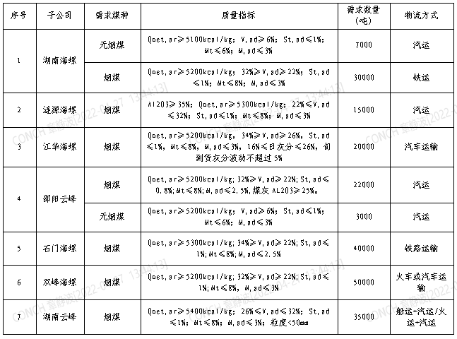 根據(jù)2022年5月21日-2022年6月20日海螺水泥湖南區(qū)域各子公司煤炭需求,現(xiàn)擬對煤炭進行公開招標,選定中標人,為體現(xiàn)公平、公正、公開的原則,拓寬采購渠道,現(xiàn)將招標相關(guān)事宜公告如下: