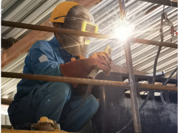 當(dāng)時里面溫度高達(dá)40多度,呂道廣并不驚訝,他說“這比前幾天可涼快多了”,此時的他在進(jìn)行挖機(jī)護(hù)欄焊接,更好保護(hù)挖機(jī)設(shè)備,降低事故風(fēng)險。即便早已得心應(yīng)手,他也始終保持謹(jǐn)慎與專注,陽光斜射進(jìn)去,呂道廣身上閃耀的是火花的光芒,更是“海螺精神”的光芒。