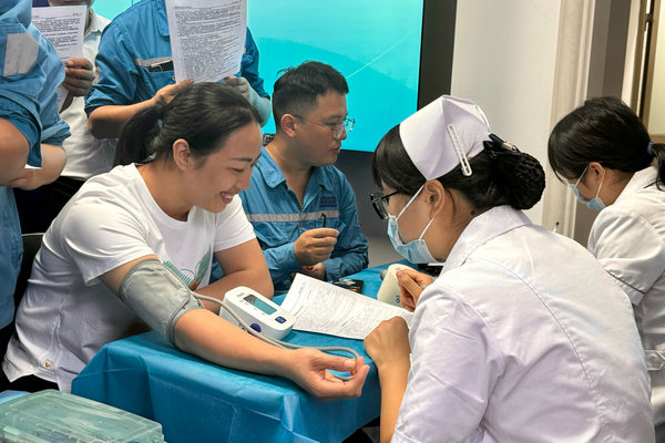 “別緊張,我會溫柔一點的,怕針頭的話就扭過頭去,你打算獻多少血呀?”“AB型是血站急需血型的話我可以多獻一點。”“多獻可不行,一次最多只能獻血400毫升哦?!薄澳俏耀I400毫升?!贬t(yī)護人員和公司員工們的對話,打破了原本有些緊張的氛圍,在場的人員都莞爾一笑。